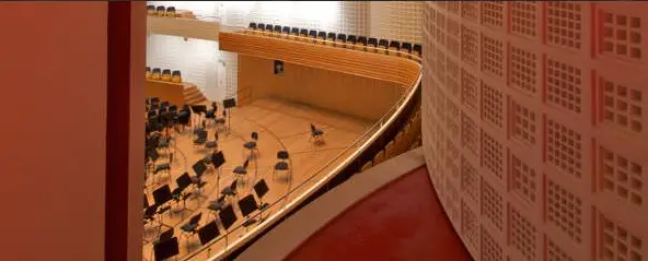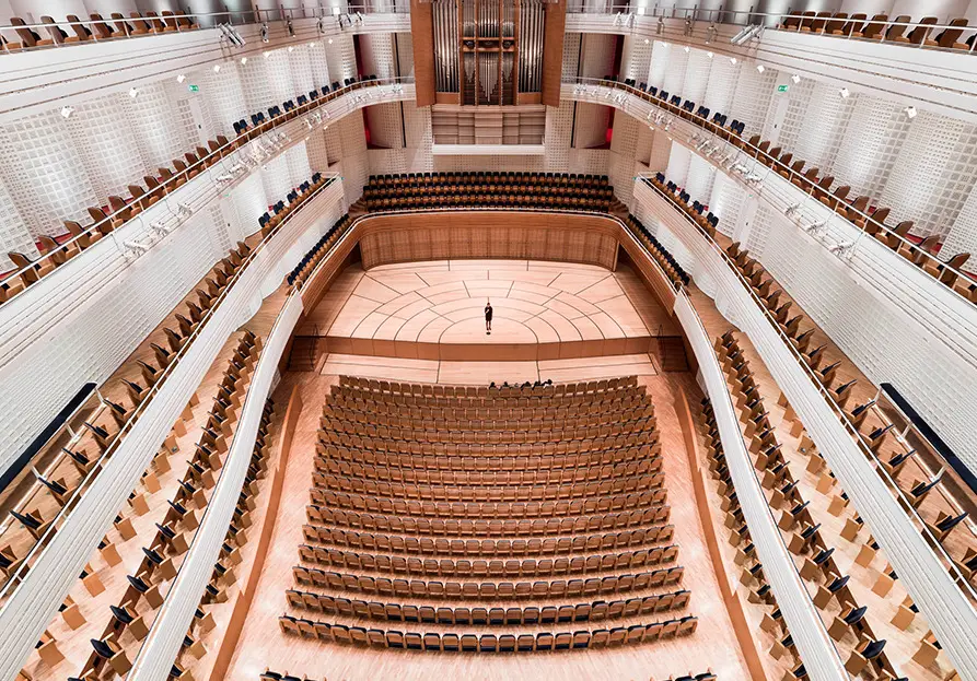 Durch die ansteigenden Sitzplätze ist die Sicht von allen 2250 Sitzplätzen aus hervorragend und die Akustik besticht durch ihre ausgeklügelte Gestaltung. Unter anderem wurde die Decke mit 136 prismenförmigen Resonatoren ausgestattet, deren Öffnung reguliert werden kann und dadurch den Verhältnissen angepasst werden kann.