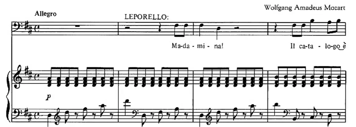 After the Allegro of the first part, Mozart changes the tempo to an Andante. In this second part of the aria, Leporello portrays the conquests with precision. Mozart lets big women have long notes, small women short notes.