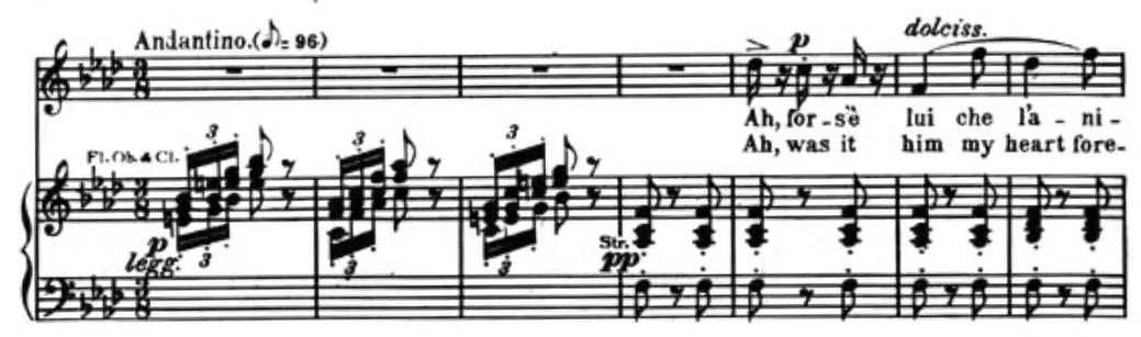 The aria begins with a questioning motif in the horns. The “A fors è lui” is written in minor which reflects the desperate hope of Violetta. It begins in p and dolcissimo:
